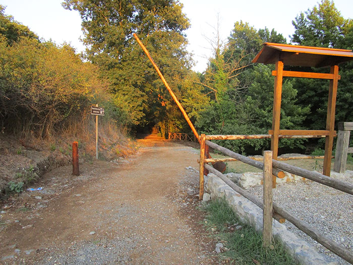 Il cartello che ci da il benvenuto, e l’entrata al sentiero che conduce alle cascate di montegelato.