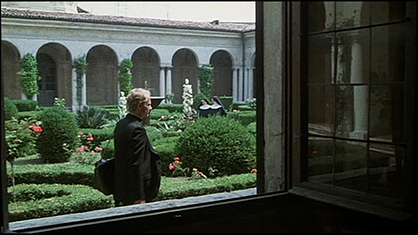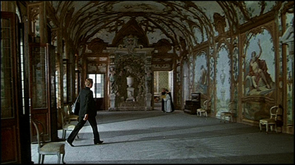 Don Camillo attraversa il “Giardino Pensile” (1). L’inquadratura è fatta dall’interno della “Sala dei fiumi” (2), preumibilmente dalla seconda finestra da sinistra. La disposizione delle aperture su questo lato, che danno al “Giardino Pensile”, è di due finestre a sinistra, tre porte centrali, e due porte a destra.