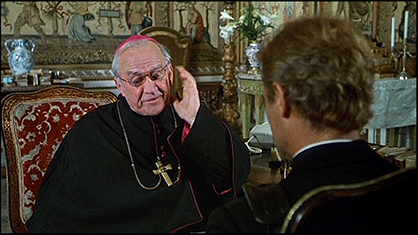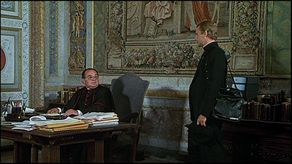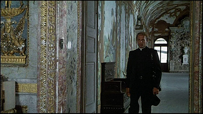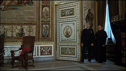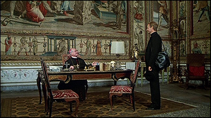 “Sala dello Zodiaco” (3). Don Camillo entrato dalla porta di destra, e dopo essersi fermato per qualche attimo con il segretario del vescovo, si dirige accompagnato verso la porta di sinistra.