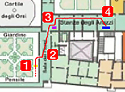 Sopra la mappa del complesso di Palazzo Ducale. Don Camillo si sposterà dal punto n°1 al punto n° 4 seguendo la linea rossa. Ogni punto rappresenta un luogo/stanza, ognuno con il suo nome.