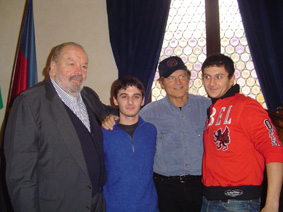 Un secondo incontro con Bud Spencer e Terence Hill c'è stato sabato 25 mattina ad Assisi al Palazzo del Comune, e in questa mattinata si è realizzato uno dei miei sogni... ancora non credo a quello che è successo! Con un mio amico aspettavamo fuori dal palazzo l'arrivo di Bud e Terence; c'erano numerose persone, non come a Perugia ma eravamo abbastanza. Ad un certo punto vedo arrivare un signore avanti con l'età e riesco a sentire che si era fatto fare l'autografo da Bud. Mi avvicino e mi faccio spiegare dove lo avesse incontrato, prendo la via indicatami ma non lo vedo per strada; poi mi ricordo che l'anziano mi aveva accennato della hall... mi giro e vedo l'albergo Dei Priori con porta a vetro. A quel punto io e il mio amico ci avviciniamo alla porta e vediamo dentro Bud Spencer seduto da solo sul divano che ci fissava! Con il mio amico con timore ci guardiamo ed entriamo, salutiamo Bud con un "Buongiorno", e lui risponde: "Prego!"... Non ci potevo credere, per un minuto siamo stati seduti accanto a Bud solo noi tre! Poi sono arrivati altri due ragazzi e ci hanno fatto la foto con Bud e noi a loro. Bud ci ha chiesto che scuola facevamo, poi gli abbiamo detto che siamo stati anche a Perugia e gli abbiamo domandato dove fosse Terence, ricevendo come risposta che si trovava all'albergo Subasio.